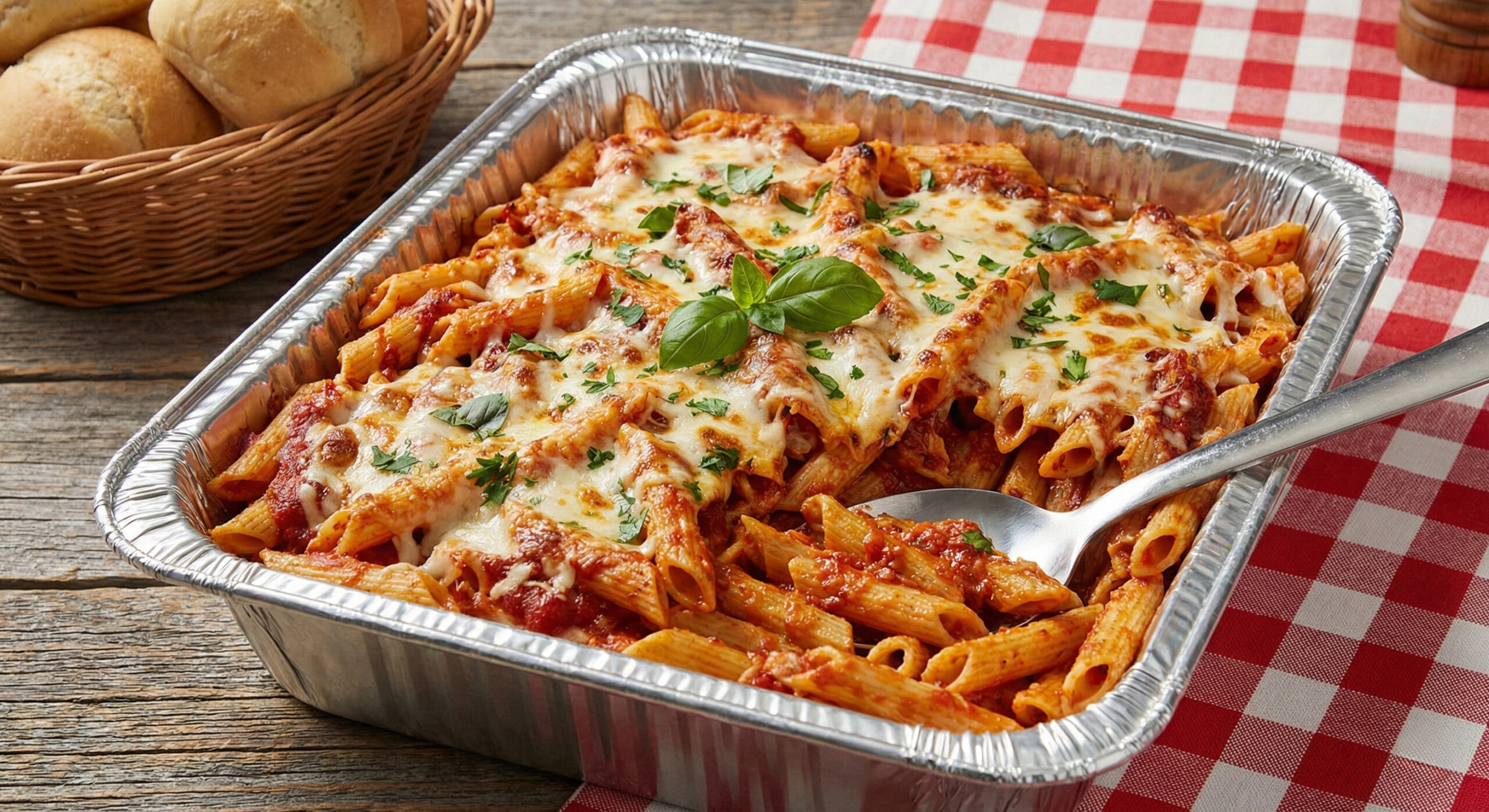Penne pasta baked with tomato sauce and mozzarella cheese.