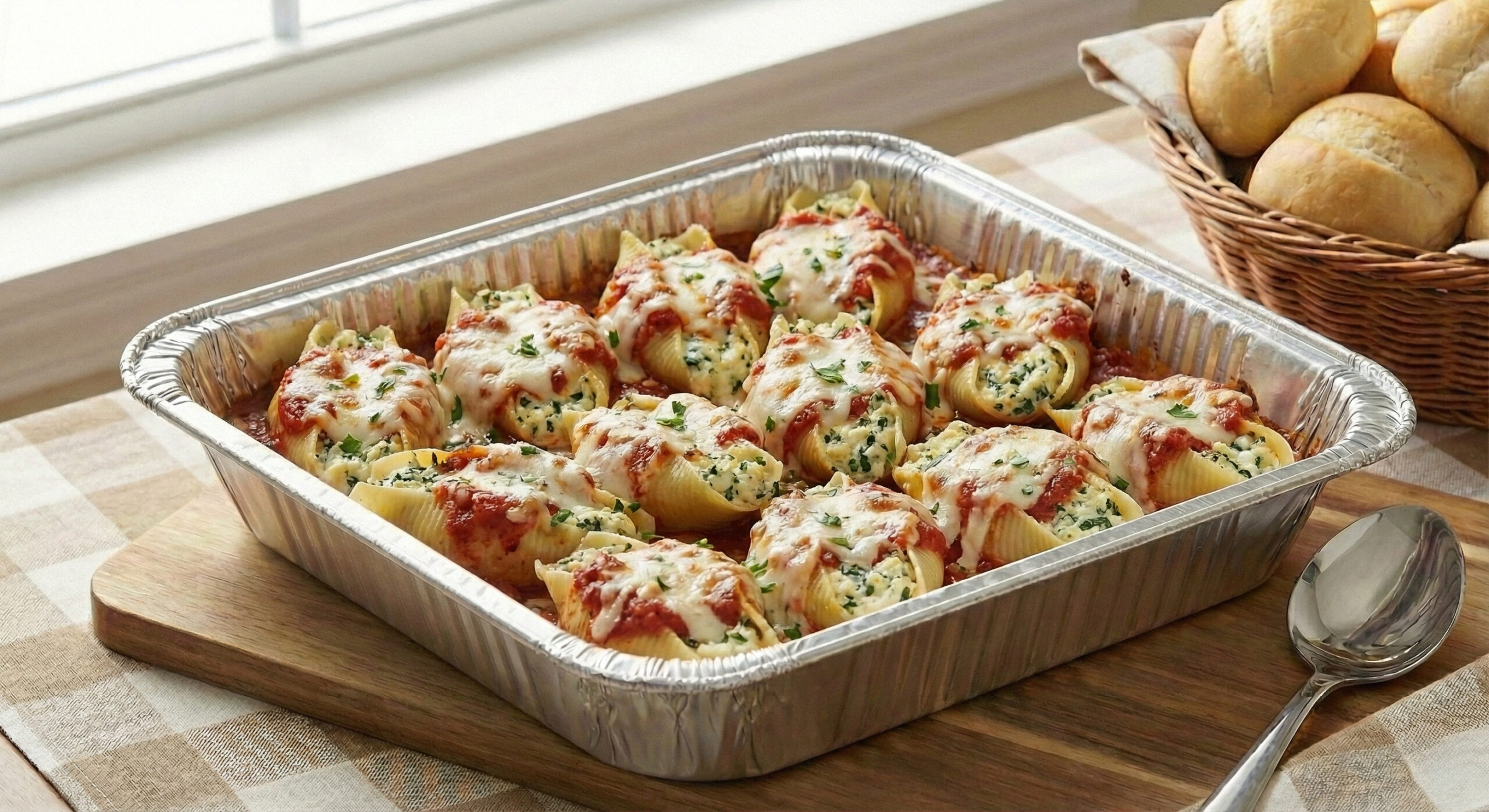 Jumbo pasta shells filled with ricotta, topped with sauce.